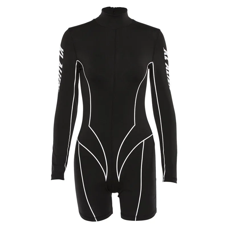 BEST 2019 women turtleneck full sleeve fitness playsuit white striped patchwork letter print push up ski